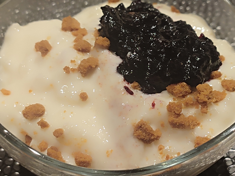 Arroz con leche, crujiente de galleta y mermelada de arándanos