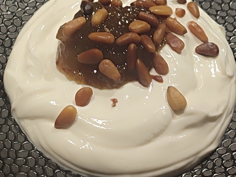 Crema de yogur con mermelada de higos y piñones